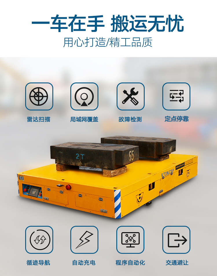AGV重載磁條引導平車是一種以電池作為電源,舵輪作為驅(qū)動系統(tǒng),磁條作為輔助,其運行不受限制,可以根據(jù)需求自動化對位,輥輪傳送,頂升,臺面旋轉(zhuǎn)等功能,載重能力1-30噸