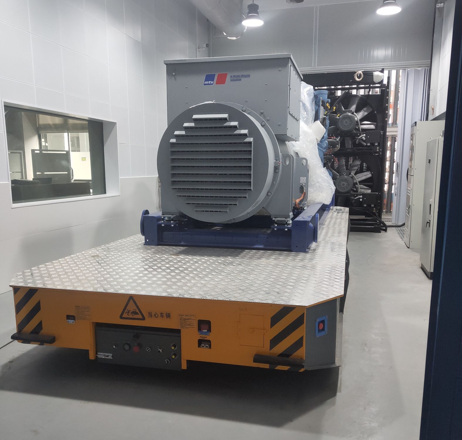 本案例是應(yīng)用于發(fā)電機(jī)組廠家車間內(nèi)完成產(chǎn)品成型后在檢測、試驗、倉儲等工位的轉(zhuǎn)運(yùn),工位處于不同車間,路途中有轉(zhuǎn)彎,有坡道;選用無軌電動轉(zhuǎn)運(yùn)平車,大容量蓄電池組供電,車體規(guī)格較大,為適應(yīng)現(xiàn)場較狹窄通道,不至于發(fā)生剮蹭通道邊其它設(shè)備狀況,車體做了倒角處理,并含有聲光報警、遇障礙物停止、觸碰式開關(guān)等安全警示裝置。