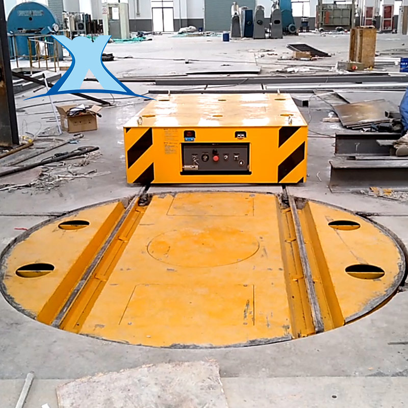 是一種以實(shí)現(xiàn)軌道平車原地轉(zhuǎn)彎換向的設(shè)備,安裝在兩條軌道交叉的位置,其臺(tái)面上鋪設(shè)一條或多條軌道,軌道上表面與地面上的軌道上表面平齊,軌距與地面的軌距一致,平車完全運(yùn)行至轉(zhuǎn)盤上停止,轉(zhuǎn)盤啟動(dòng)轉(zhuǎn)動(dòng)至需要的角度與地面的軌道完成對(duì)接,平車再次啟動(dòng)沿對(duì)接后的軌道運(yùn)行至需要的位置。其特殊的功能是軌道運(yùn)輸系統(tǒng)中常見的設(shè)備。臺(tái)車自重加載重就是配套轉(zhuǎn)盤的載重量,轉(zhuǎn)盤的旋轉(zhuǎn)角度可根據(jù)客戶的不同需求設(shè)定,可實(shí)現(xiàn)360度任何一個(gè)角度停止,也可實(shí)現(xiàn)井型十字交叉運(yùn)行。